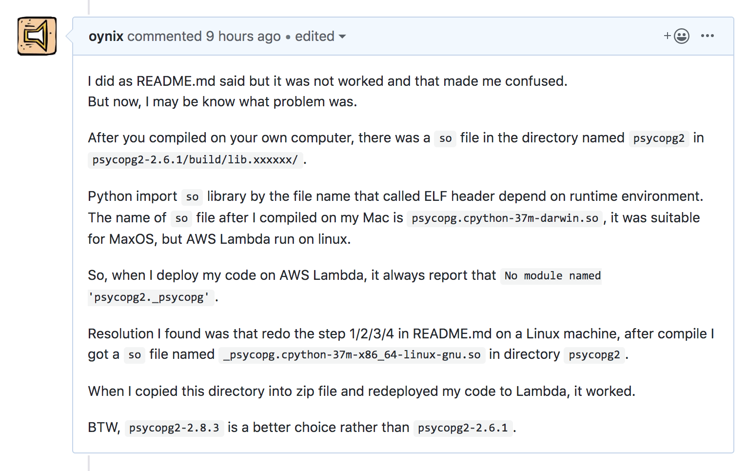 在Github上搜到了awslambda-psycopg2,作者介绍说是专门解决在Lambda上使用psycopg2的。