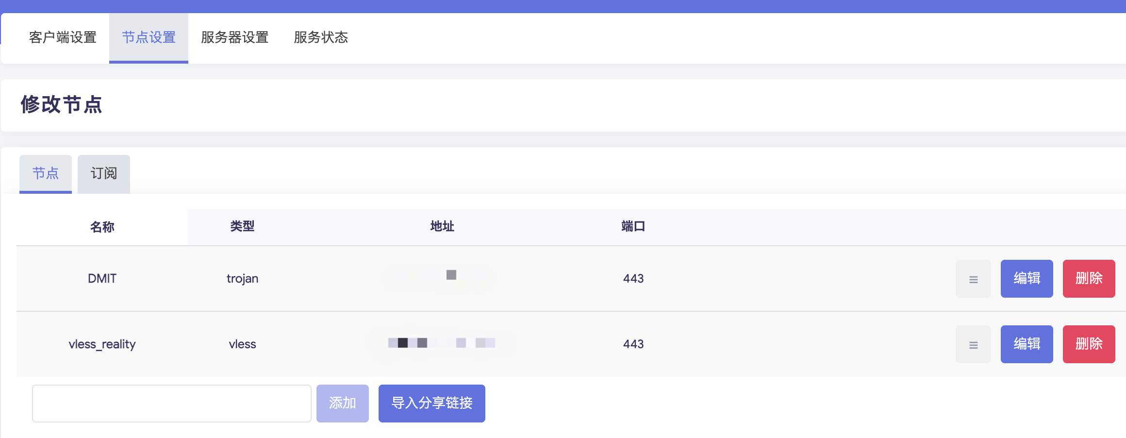 因为我一直在用的机场主良心坏了,不给订阅链接了,所以我现在就只有 2 个手动配置的节点,实际上这 2 个都在同一个 VPS 上,只是协议类型不同而已,一个是 Trojan + TLS,一个是 VLESS + Reality。在订阅页面中添加订阅链接后,其中的节点也会出现在这个列表里。