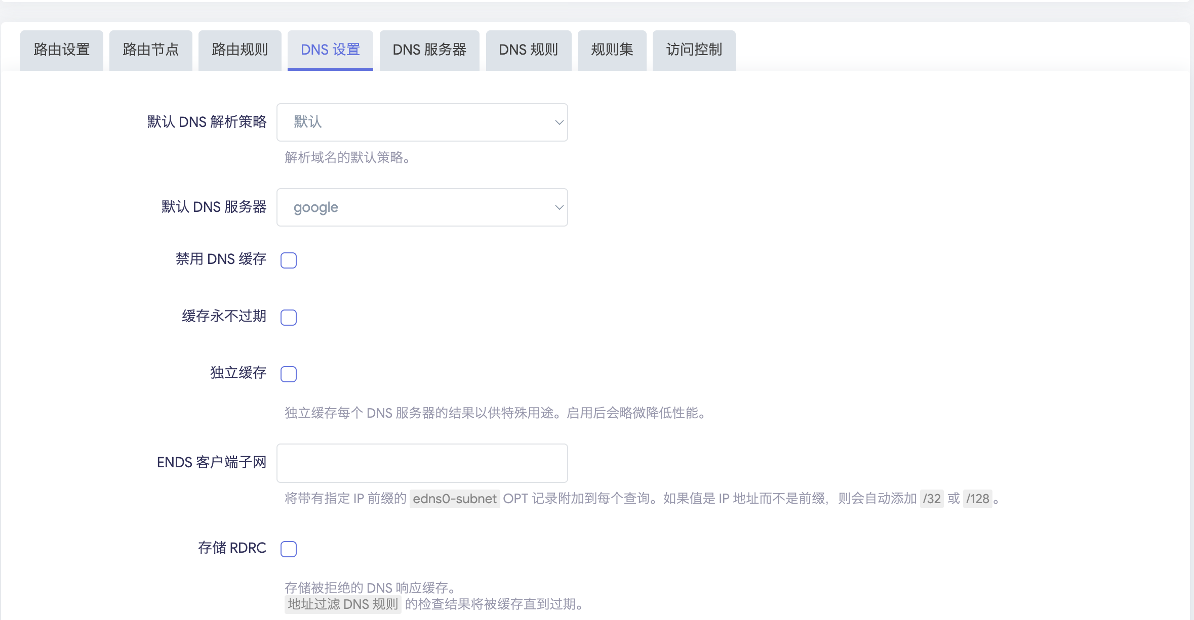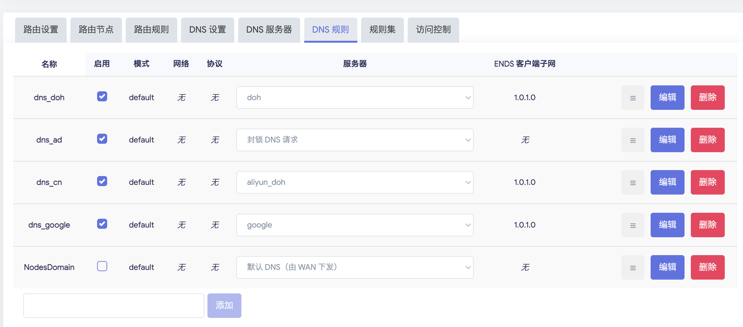 这里的 DNS 规则,和前面的路由规则基本类似,区别就在于,路由规则是用来匹配域名,命中后采用不同的策略,直连、拒绝或是走代理。而 DNS 规则也是用来匹配域名,命中之后使用配在规则里的服务器解析域名的 IP,就这么点区别。