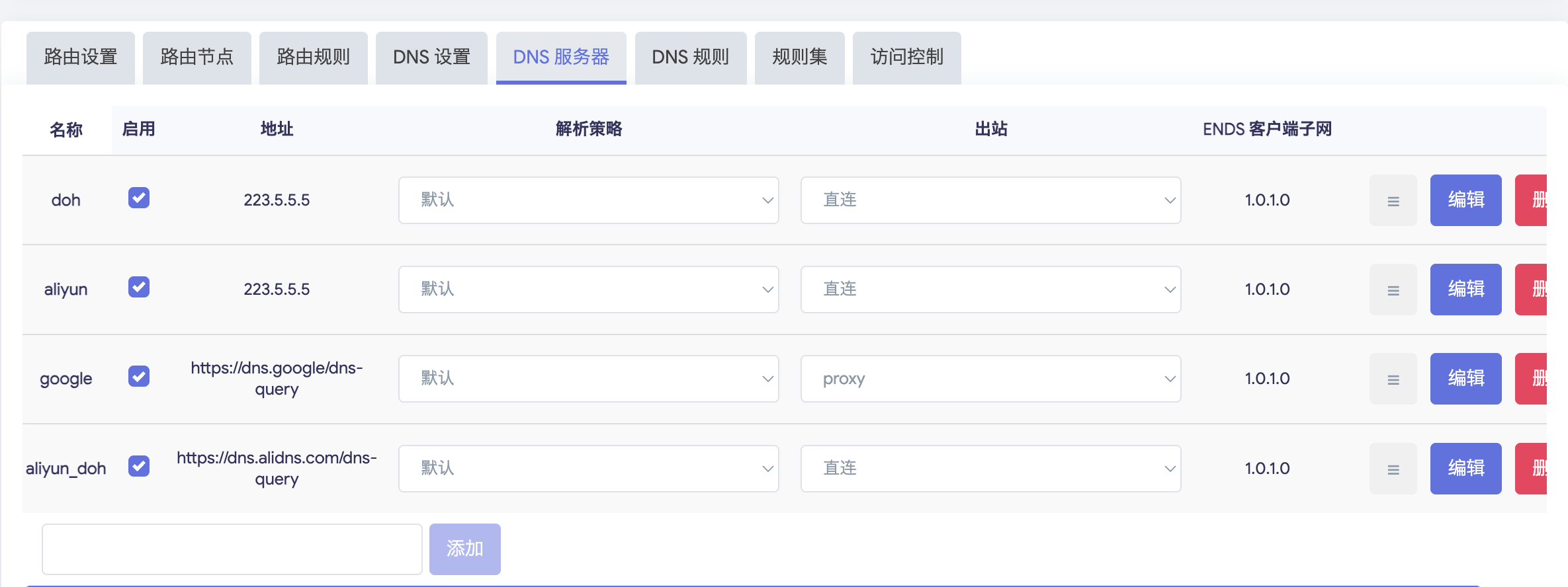 可以看到,每个服务器除了服务器地址,还有一个出站选项,意思就是,发给 DNS/DoH 服务器的流量,使用什么策略出站,直连就是直接发出去,选节点组就是先发给节点,让节点去转发。这里其实都选直连就可以。
