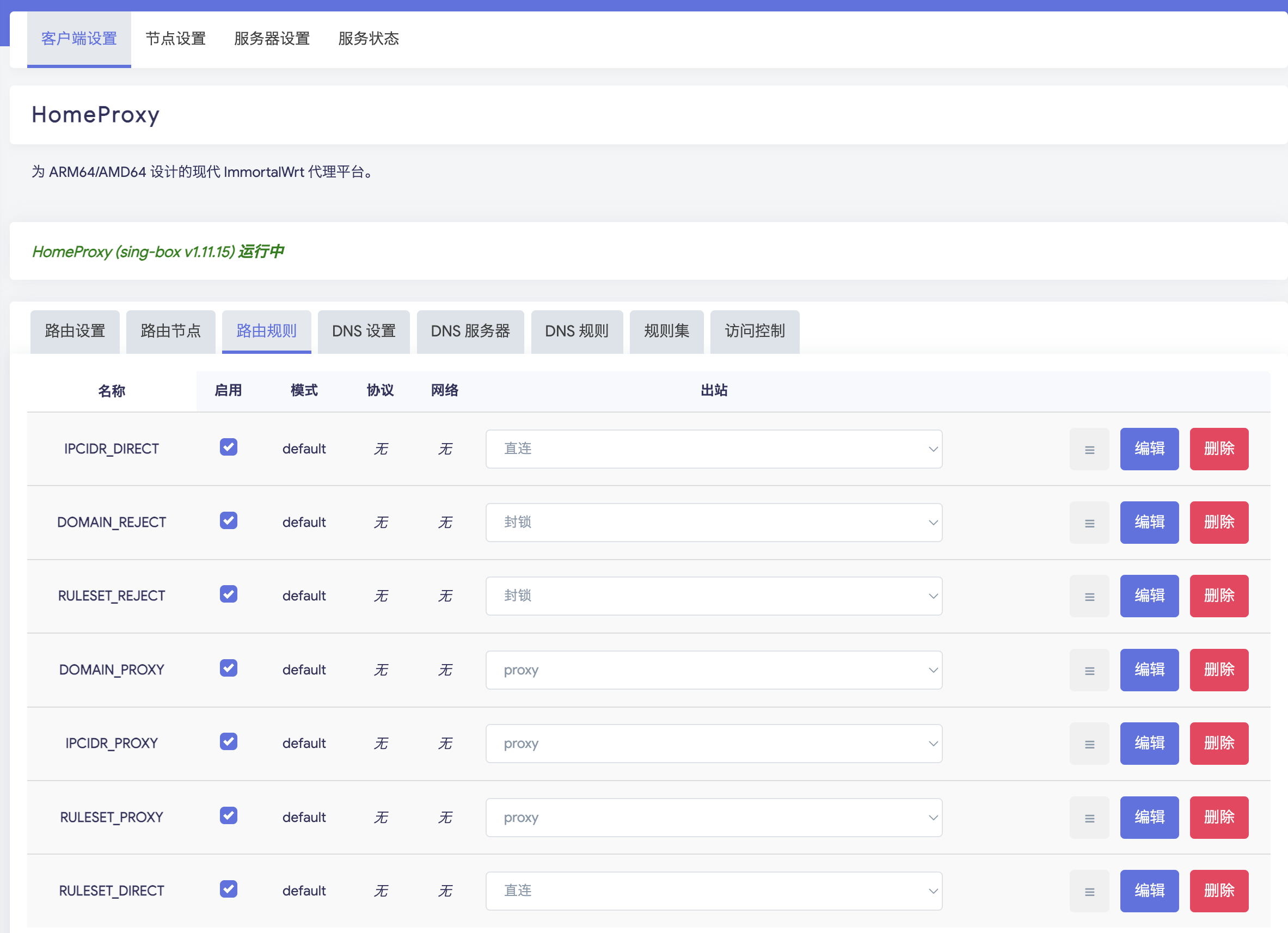 HomeProxy 上路由分了 2 个页面,一个是出站节点组,一个是匹配规则。
